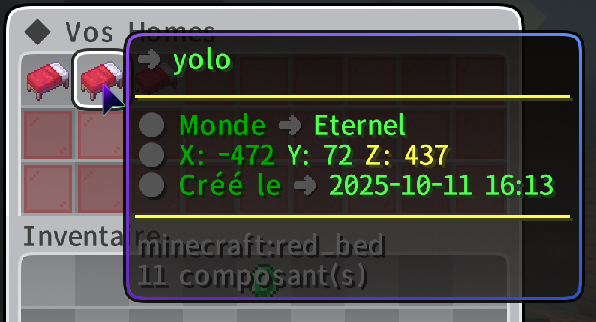 /homes: ouvre le menu des homes. Peut aussi s’ouvrir via clic droit avec une pierre et/ou une clé dans la main (selon l’objet que tu utilises).